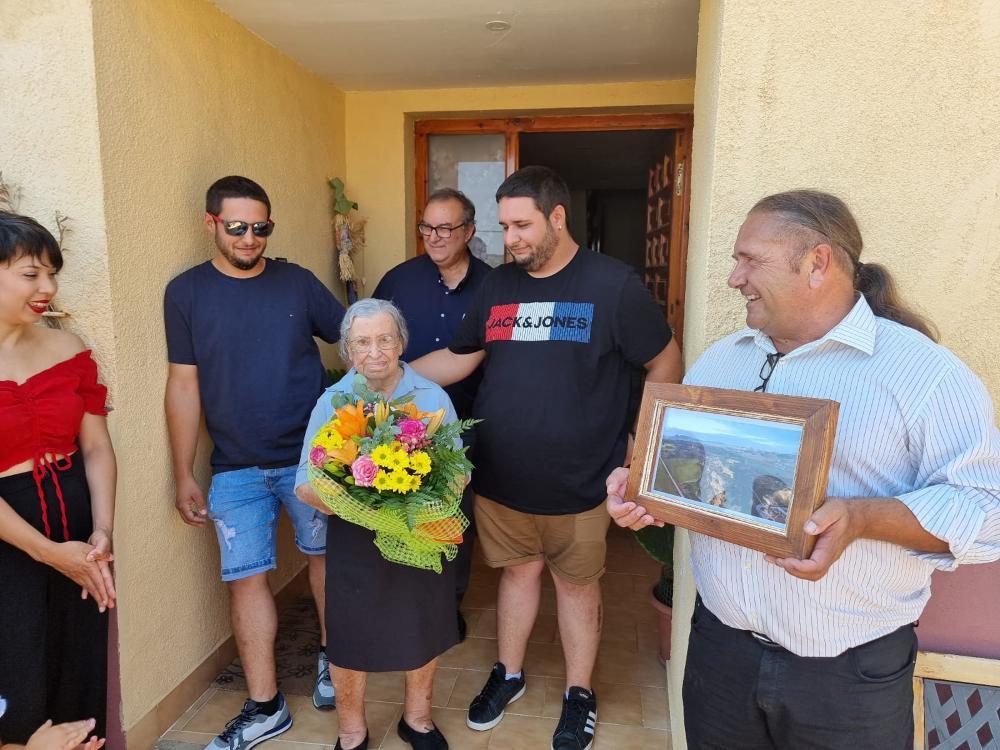 Para finalizar la jornada, el nuevo pleno de la Corporación acompañados de numerosos vecinos se acercó a casa de María Laborda Launa, una longeva vecina comprometida con el municipio para felicitarla y hacerle entrega de un presente en su 100 cumpleaños.